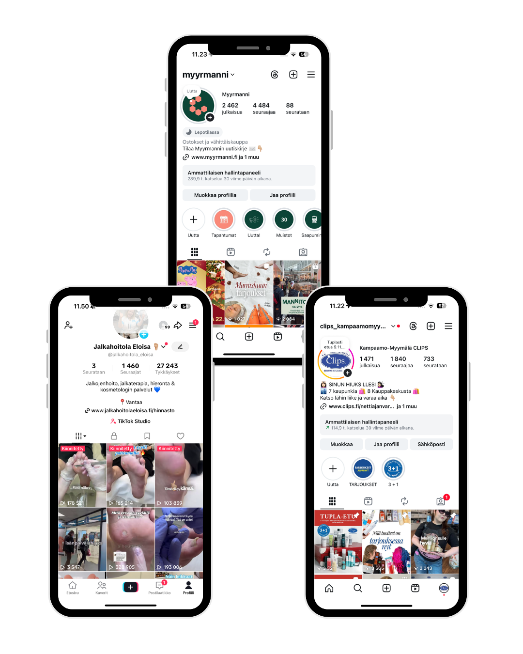 Teemme somea, jolla on yrityksellenne merkitystä, eikä yksikään asiakkuutemme ole samanlainen. Tuotamme asiakkaillemme monipuolisesti sisältöä aina asiakkaan tarpeiden ja kohderyhmän mukaisesti. Kuvaamme sisällöt toimitiloissanne laadukkailla puhelimilla sekä ketterästi mukana kulkevilla lisävaloilla ja mikrofoneilla.